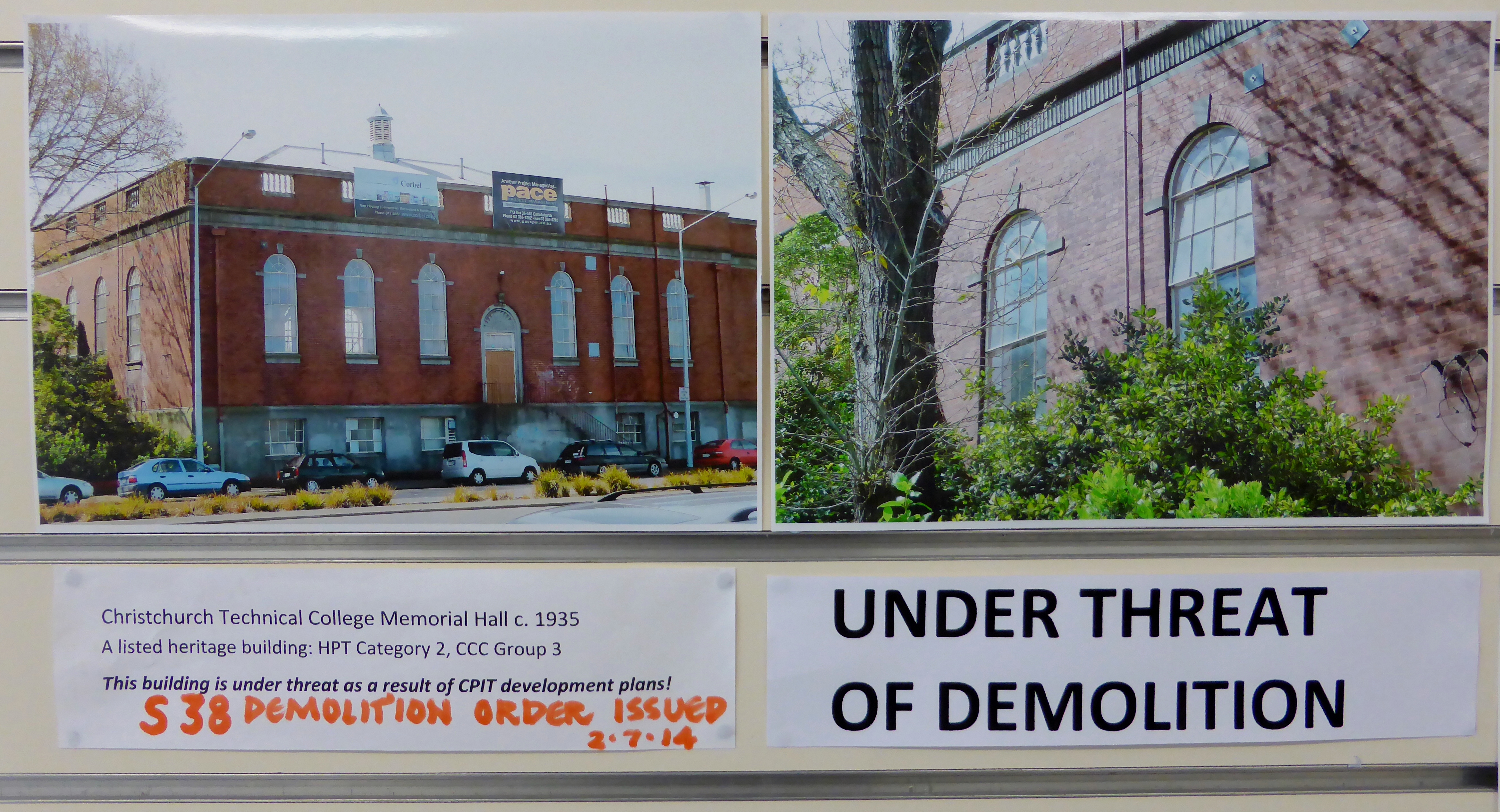 Concerned citizens and Canterbury heritage groups including Historic Places Canterbury, IConIC and Civic Trust are appalled at the news that CERA has issued an s38 demolition order on the Christchurch Technical College (now CPIT) Memorial Hall at the request of CPIT.