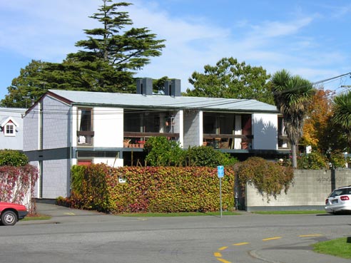 Photograph: Dorset Street Flats, Christchurch. Designed by Miles Warren. Design and built 1956-57. Photo by JMG.