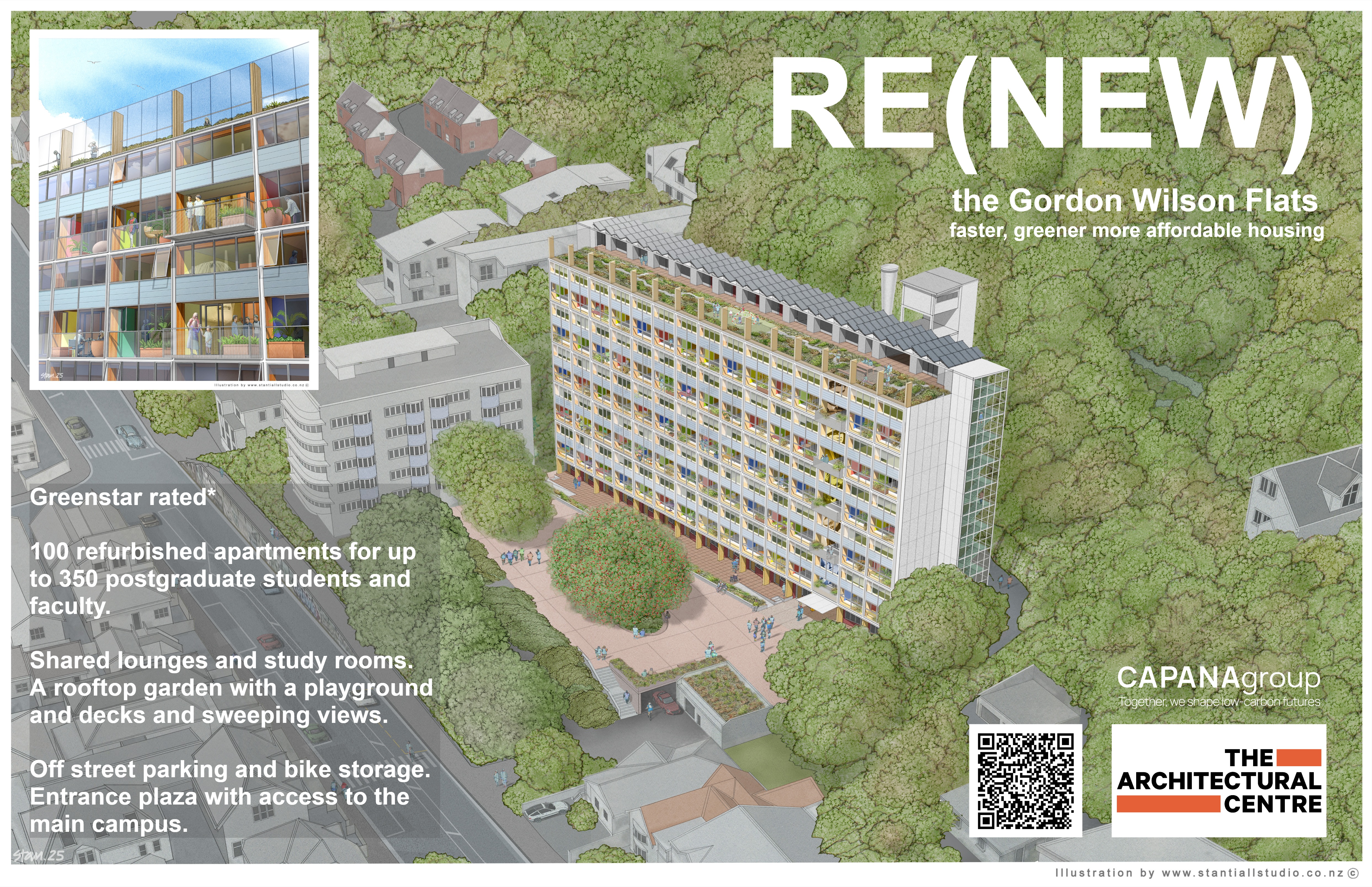 The Architectural Centre Inc., Wellington, has developed a design for the strengthening and refurbishment of Wellington’s Gordon Wilson Flats (1954-59), which Victoria University of Wellington has allowed to deteriorate while leaving it vacant and which it intends to demolish, just as soon as it is given consent to do so. The government’s Resource Management (Consenting and Other System Changes) Bill has been introduce to enable the demolition, by facilitating the building’s descheduling. The Architectural Centre’s design retains 80 percent of the building’s concrete structure and they calculate that it would save ca. 92 percent of the carbon compared with demolition and building anew. The retention and adaptation of existing buildings is essential in efforts to mitigate climate change, given the embodied energy contained in the existing materials combined with the carbon footprint of new replacement buildings. DOCOMOMO New Zealand commends the Architectural Centre on its initiative and joins with them in urging Victoria University to reconsider its plans.